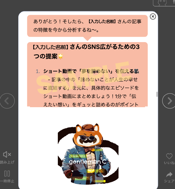 5記事全部を入力すると、Xroidがあなたの記事の特徴を分析してSNSが広がるための3つの提案やメッセージをくれます。